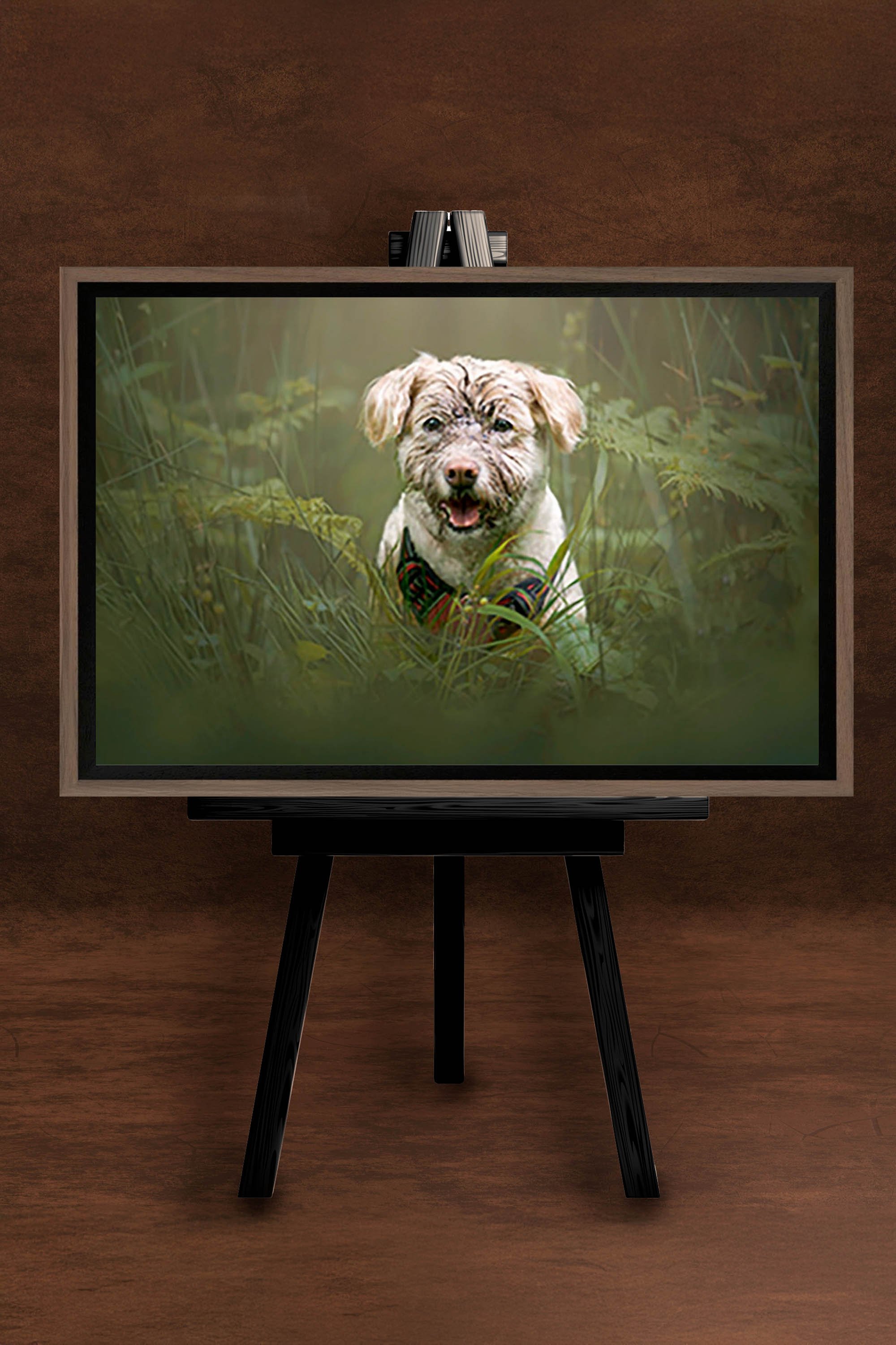 After the session, I put together all the images and returned to show Howard his final portraits. Interestingly, the one he chose as his favourite wasn’t the perfectly groomed shot, but the one that truly captured Buntzi’s spirit—harness on, muddy, scruffy, and joyfully bounding through the grass. I remember him saying, “That’s the one—that’s Buntzi!”